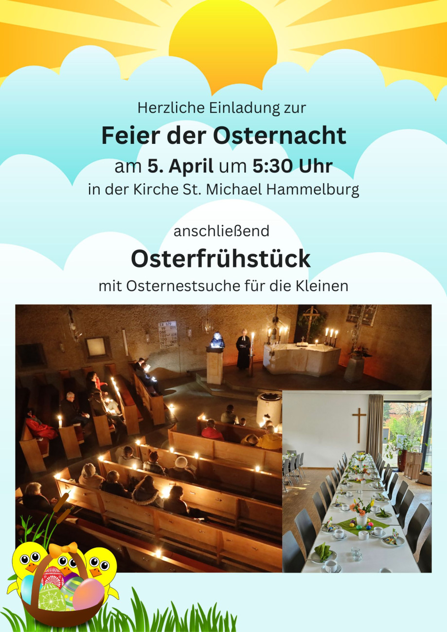 Im Anschluss an den Gottesdienst gibt es im Martin-Luther-Haus ein leckeres Osterfrühstück, zu dem alle herzlich eingeladen sind. Für die Kinder hat der "Osterhase" eine kleine Überraschung bereit.